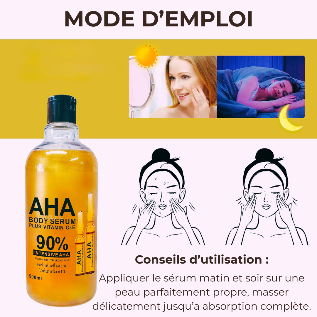 Les acides alpha-hydroxylés (AHA) exfolient la peau en douceur et aident à améliorer l’éclat du teint. Pour les peaux sensibles, il est conseillé de commencer par 1 application par jour puis d’augmenter progressivement. L’utilisation d’une protection solaire en journée est recommandée.