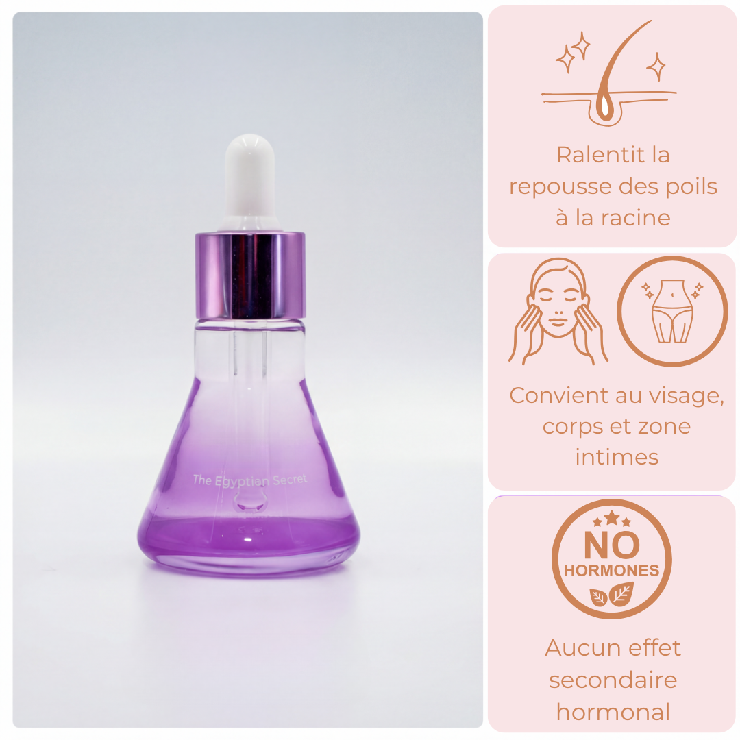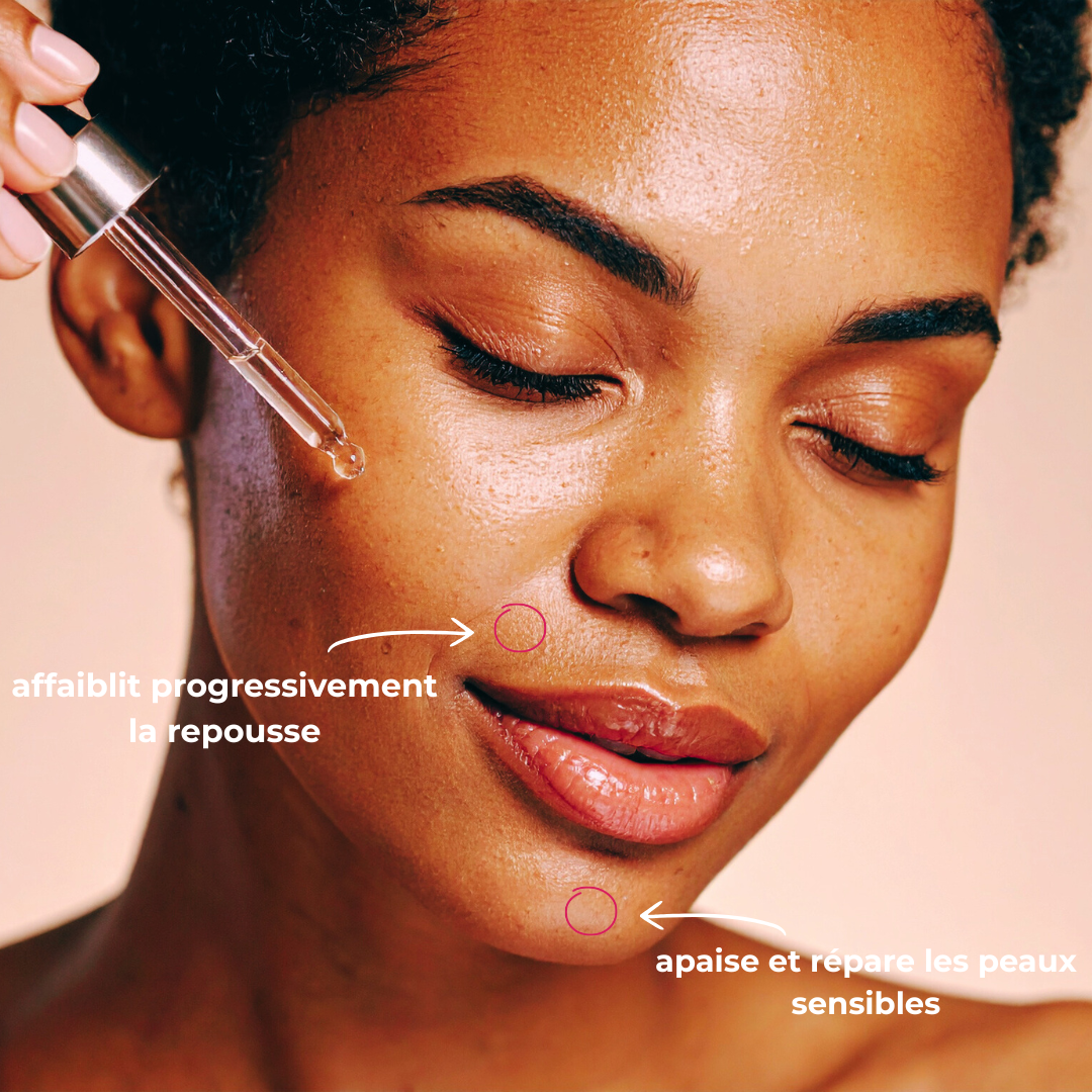 Notre sérum agit comme un soin réparateur et hydratant tout en aidant à ralentir progressivement la repousse des poils.