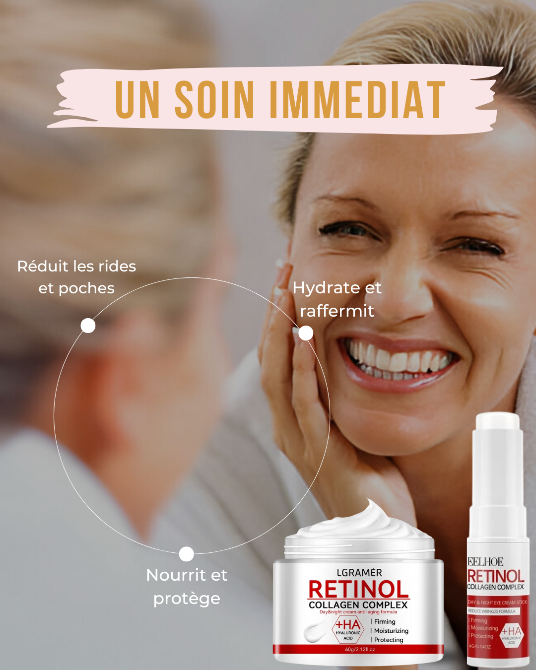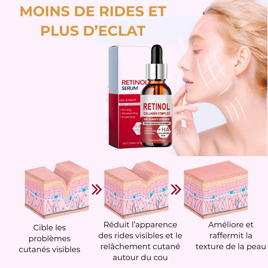 Le rétinol agit de nuit, tandis que le collagène et les agents hydratants renforcent l'effet au quotidien.